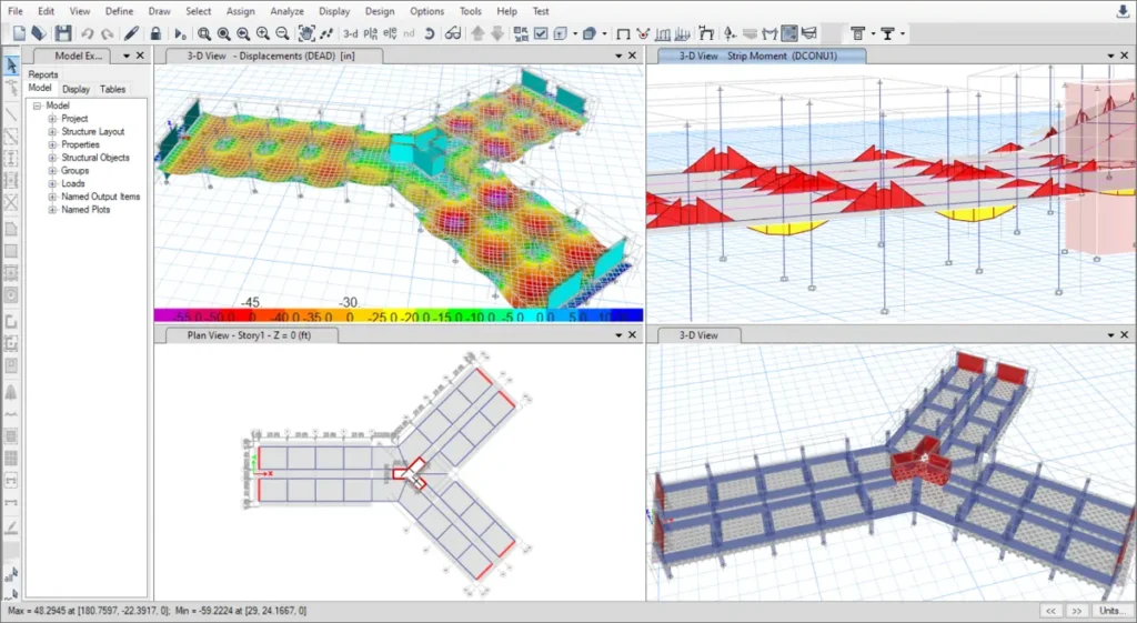 SAFE برای طراحی و تحلیل دالهای بتنی و سیستمهای فونداسیون مانند فونداسیون رادیه و منفرد به کار میرود. این نرمافزار بهطور ویژه برای پروژههای فونداسیون و سیستمهای کف ساختمان طراحی شده و از دقت بالایی در تحلیل بارهای استاتیکی و دینامیکی برخوردار است. SAFE میتواند ترکخوردگی دالها و رفتار غیرخطی آنها را تحلیل کند.