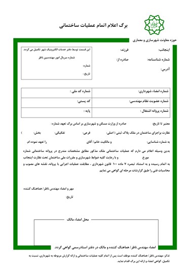 - تکمیل فرم درخواست پایان کار و تشکیل پرونده: با ارائه مدارک لازم به شهرداری منطقه مراجعه کرده و فرم درخواست پایان کار را تکمیل کنید.